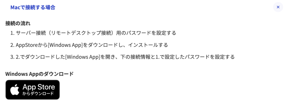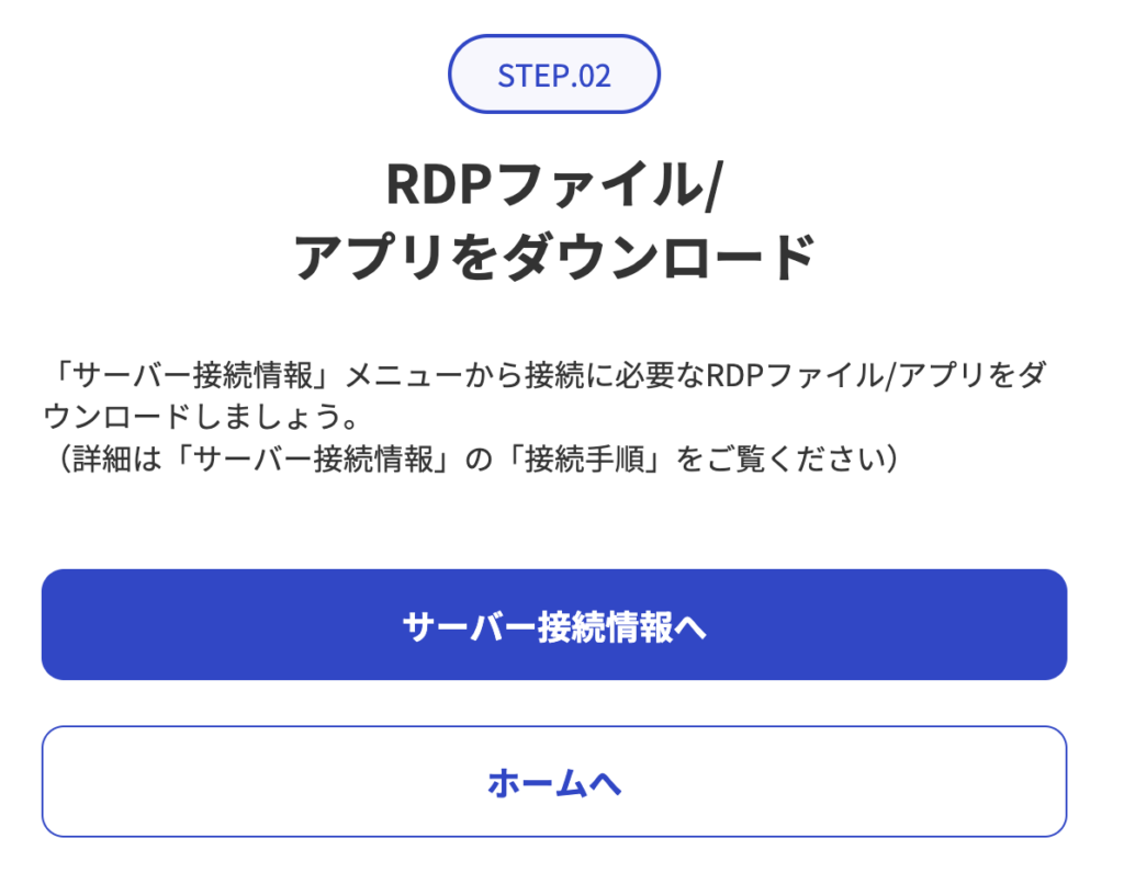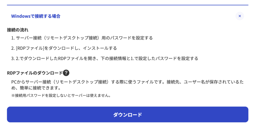 稼働中になったVPSは、リモートデスクトップを利用して操作する必要があります。リモートデスクトップ接続は、以下のRDPファイルをダウンロードすると簡単です。